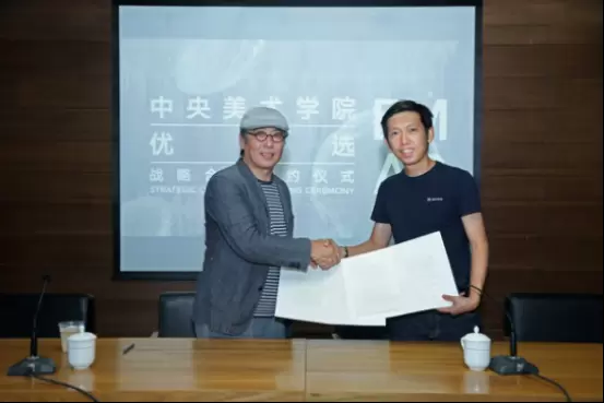 中央美术学院设计学院院长宋协伟教授(左)与优必选首席品牌官谭旻(右)签署战略合作协议