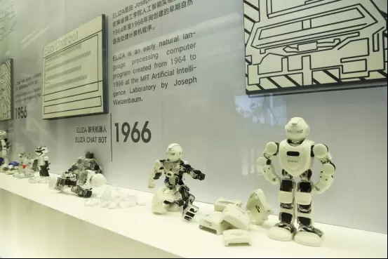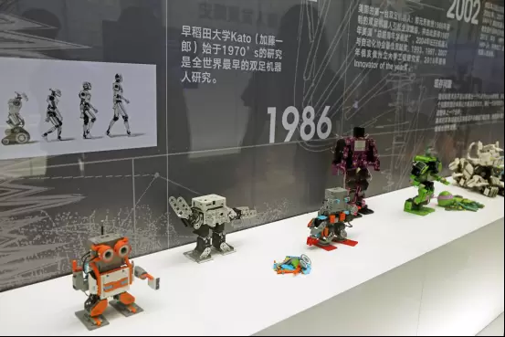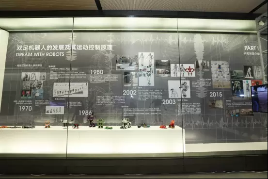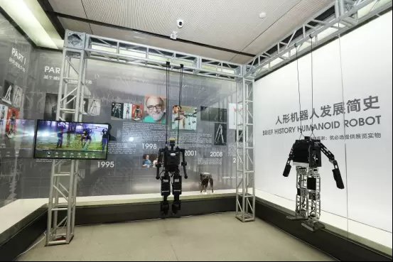通过现场大型展板上的介绍文字和视频资料,观众可以了解人形机器人的发展简史与大事记,同时,现场还展出了多款由优必选机器人零件、半成品和成品组成的艺术展品,多台悬挂空中的优必选双足机器人模型更是极具科技感。通过欣赏由机器人打造的艺术品,观众可以更为直观地感受人形机器人逐渐丰富、精细的功能及造型。艺术结合科技元素的呈现方式,给现场观众留下了深刻的印象。