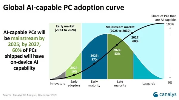 市场研究机构Canalys预测,AI PC出货量在2025年将跃升至1.03亿台,而到了 2027 年,AI PC出货量的60%将应用到商用领域。