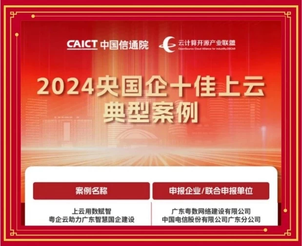 近日,中国信息通信研究院“2024央国企十佳上云典型案例”遴选结果揭晓,天翼云科技有限公司联合广东交易控股集团所属广东粤数网络建设有限公司、中国电信股份有限公司广东分公司共同打造的“上云用数赋智——粤企云助力广东智慧国企建设”项目从上百个参评案例中脱颖而出,成功入选,代表了信通院对该项目在技术实力和创新能力上的权威认可。