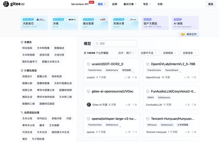 Gitee AI 已先后与天数智芯、沐曦 MetaX、华为昇腾、曙光智算、燧原科技、壁仞科技等国内顶尖算力厂商达成合作关系(更多国产算力正洽谈接入中),共同推动算力资源普惠化,使更多开发者能够以更低的门槛参与到 AI 的创新浪潮中。