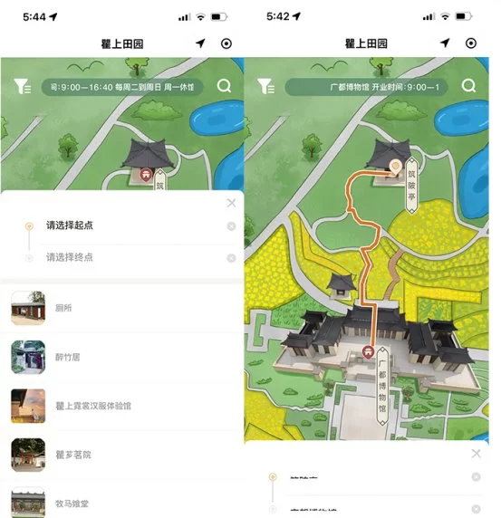 经过前期对瞿上田园景区需求的充分调研,结合当下游客游览喜好,凭借多年在文博/文旅领域积累的数字化解决方案经验,积木易搭为瞿上田园打造了“步行导航小程序”。该小程序设计的核心是以景区内各个景点、停车场和卫生间等配套服务区为站点,采用三维建模、国风手绘相结合的方式,对园区地图进行重新绘制,结合GPS定位和方向功能,为景区打造“国风定制款”定位导航服务。