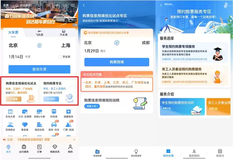 其实早在2024年4月,铁路12306 App就已完成鸿蒙原生应用核心版本开发,并且在2024年9月全量上线。目前鸿蒙原生版铁路12306不仅支持火车票下单、改签、退票等基础功能,还上线了车站大屏、时刻表、温馨服务等车站服务,以及酒店住宿、门票旅游、租车约车等出行服务。近日,随着春运购票高峰期的临近,鸿蒙原生版铁路12306也已经支持了购票信息预填、学生和务工人员预约购票等服务,在鸿蒙原生版铁路12306首页选择对应服务并按指引操作即可,帮助大家提高购票的成功率。