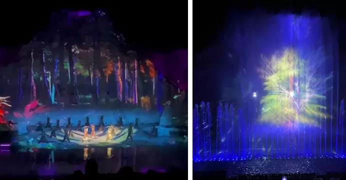 这场演出在山体、地面和水幕等各种表面上进行了大规模投影。巨大的投影区域长达80米,高25米,这就要求科视Christie DWU19-HS投影机所具备的高精度和高灵活性。
