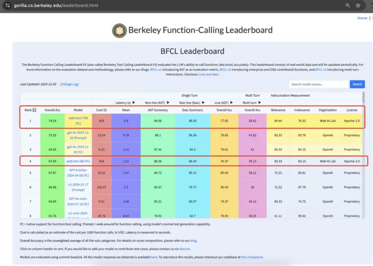 近日,由盛大AI团队研发的模型Watt-tool-70B和Newsbang/homer-72B,登上国际知名AI排行榜榜首。其中,Watt-tool-70B是由盛大旗下Watt团队研发的旗舰模型,目前位列BFCL Leaderboard总榜单第一。