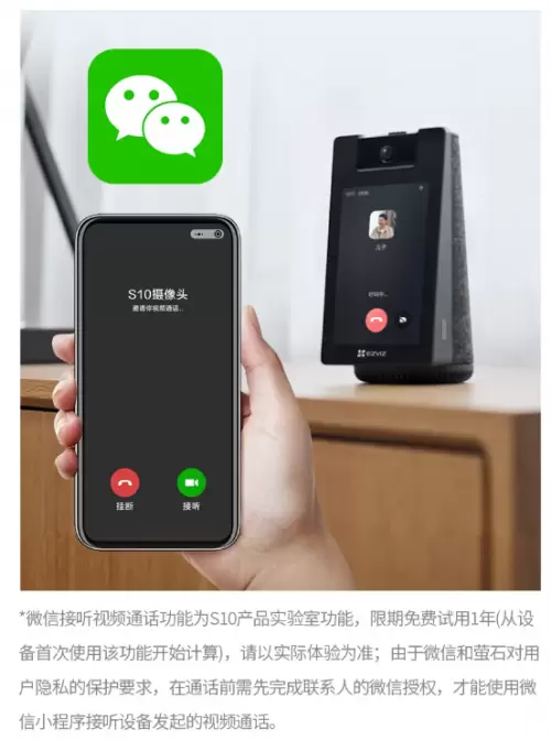 在产品的功能升级中,S10 4G版还增加了微信接听视频呼叫的功能。用户可以通过微信小程序接听摄像头端发起的视频通话,这一设计更符合大众的使用习惯,进一步简化了操作流程。值得一提的是,该功能目前作为实验室功能免费开放1年,为用户提供了更多便捷选择。