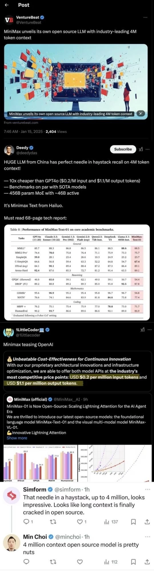MiniMax-01模型发布后,在国内外迅速掀起了热议浪潮。海外媒体与AI从业者聚焦该模型,深入探讨其技术内涵与潜在价值,对其所展现出的创新性给予了高度肯定。