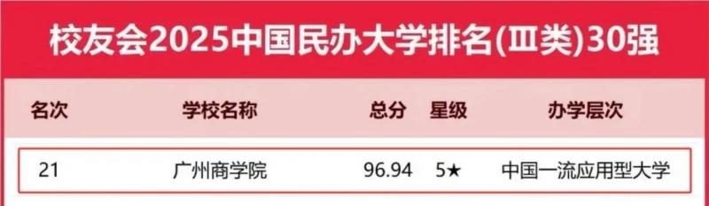 1月6日,备受瞩目的校友会2025中国大学排名正式发布,推出系列大学排行榜,在“校友会2025中国民办大学排名(Ⅲ类)”中,广州商学院以96.94分排名第21,同时被评为5星级“中国一流应用型大学”,位居广东同类院校榜首。在“校友会2025中国财经类民办大学排名”中,广州商学院再次跻身前10强,是广东省同类院校中唯一入选的高校。
