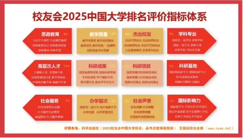 校友会2025年中国大学排名评价指标体系由办学层次、思政教育、教学质量、杰出校友、高层次人才、学科专业、科研项目、科研基地、科研成果、社会服务、社会声誉和国际影响力等12个一级指标构成,以艾瑞深大学360度全景数据平台为数据支持,基于“大平台、大团队、大项目、大成果、大校友”体系框架展开系统评价,包含的评价指标高达900多项,是目前中国评价指标最多的大学排名。