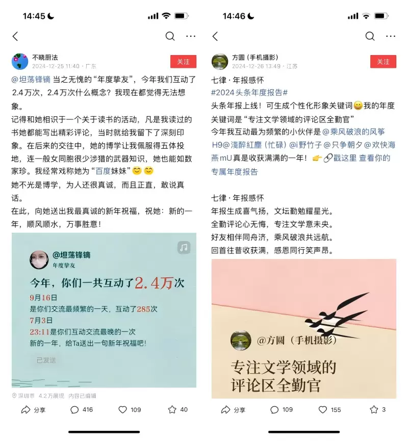 与此同时,本次头条年度报告还加入了“年度挚友”推荐功能,为用户列出“年度挚友”和“互动top5朋友”等。在各大App年度报告越来越“卷”的今天,今日头条回归用户自身,关注最本真的探索、求知和社交,这一举动切中了当代人心底最柔软的所在。不少平台用户纷纷晒出自己和“年度挚友”的互动故事,这其中有满满的感激与感动,有那份友谊“让我泪眼朦胧”,也有那份鼓励“使我受益匪浅”;还有用户晒出了与“年度挚友”的2.4万次互动数据,强烈的求知欲和惺惺相惜之情溢于言表;更有用户当即赋诗一首“回首往昔收获满,感恩同行笑声昂”,字里行间皆是对美好岁月的每日倾注。