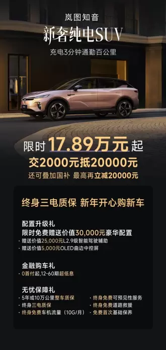 国家队水准的硬核三电带来了同级领先的充电速度和超长续航,解决了新能源汽车的关键痛点,而越级的空间和配置也带来了优质的日常用车和出行体验。岚图知音限时优惠后新车仅17.89万元起,享受官方多重好礼的同时还能叠加国补优惠再省20000元,超高性价比让岚图知音成为新春购车的理想之选。目前岚图已在杭州地区布局多家门店,心动不如行动,到店拿好礼开新车,即刻迈向美好新年!