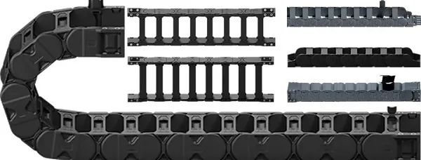 拖链是一种机械工具的元件。采用拖链来保护和引导能源、数据、信号、以承受各种外界环境带来的影响。在移动过程中,引导电缆的决定性因素是拖链电缆及其组件之间的互相作用,互相依赖关系,组件包括电缆、软管、内部分隔片、去应力元件和导槽。材料经过优化和磨合,从而达到最大运行时间和最长使用寿命。采用igus易格斯拖链系统保护电缆、气管或液压软管等负载运行,可以最大化地避免停机和节约成本。