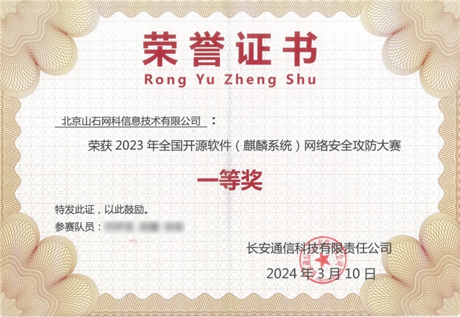3月,山石网科荣获全国开源软件(麒麟系统)网络安全攻防大赛“一等奖”。