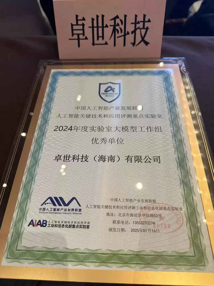 卓世科技荣获工信部2024年度实验室大模型工作组优秀单位