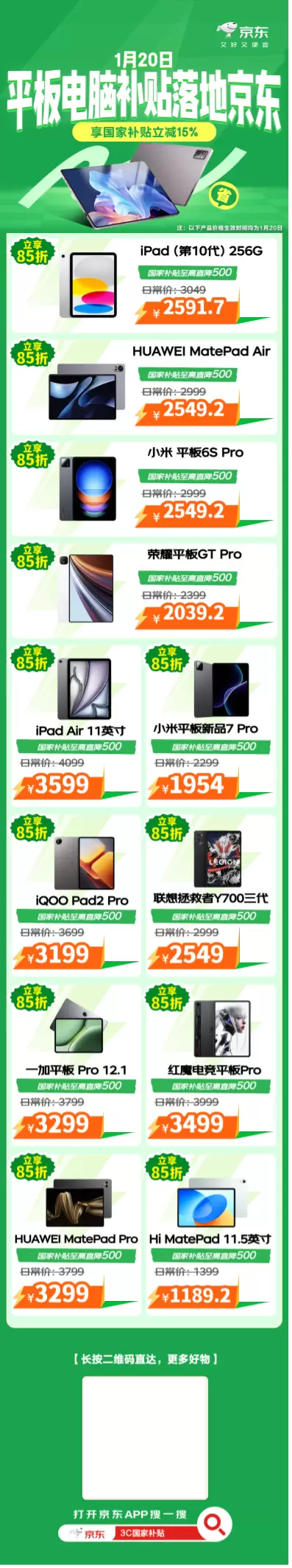 其中,iPad(第10代) 256G享受国家补贴立享85折,最终到手价2591.7元;HUAWEI MatePad Air 享受国家补贴立享85折,最终到手价2549.2元;小米平板6S Pro享受国家补贴立享85折,最终到手价2549.2元;荣耀平板GT Pro享受国家补贴立享85折,最终到手价2039.2元。iPad Air 11英寸享受国家补贴直降500元,最终到手价3599元;小米平板7 Pro享受国家补贴立享85折,最终到手价1954元;iQOO Pad2 Pro享受国家补贴直降500元,最终到手价3199元;联想拯救者Y700三代享受国家补贴立享85折,最终到手价2549元;一加平板Pro 12.1享受国家补贴直降500元,最终到手价3299元;红魔电竞平板Pro享受国家补贴直降500元,最终到手价3499元;HUAWEI MatePad Pro享受国家补贴直降500元,最终到手价3299元;Hi MatePad 11.5英寸享受国家补贴立享85折,最终到手价1189.2元。