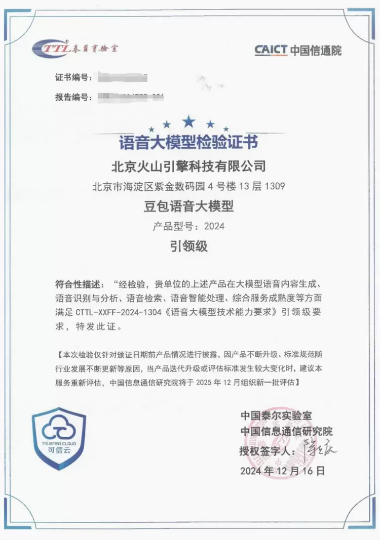 - 豆包语音大模型首家引领级通过中国信通院语音大模型评估