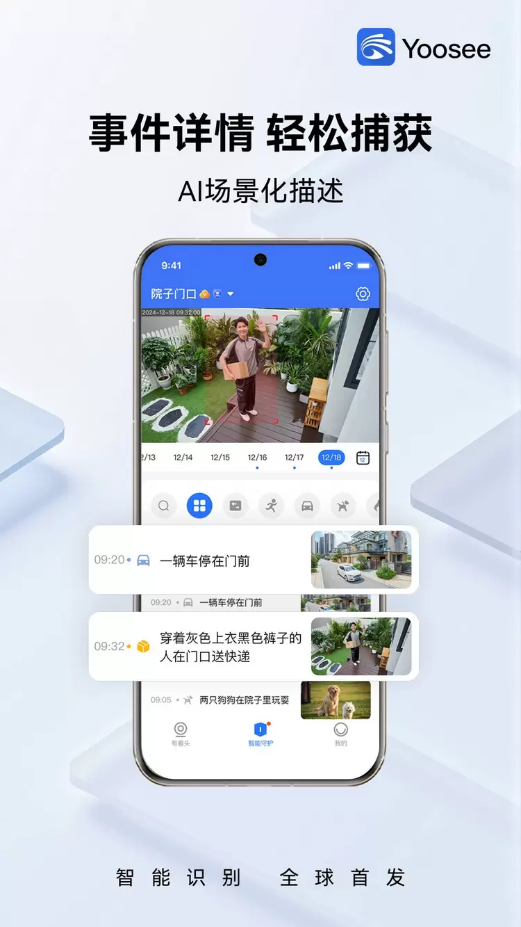Yoosee App新增“AI场景化描述”功能,AI大模型将实现图文视频精准理解,给每个事件视频匹配场景化的文字描述,准确概括每个事件视频的内容,让用户查看视频之前就能提前预览该视频记录的事件和场景。