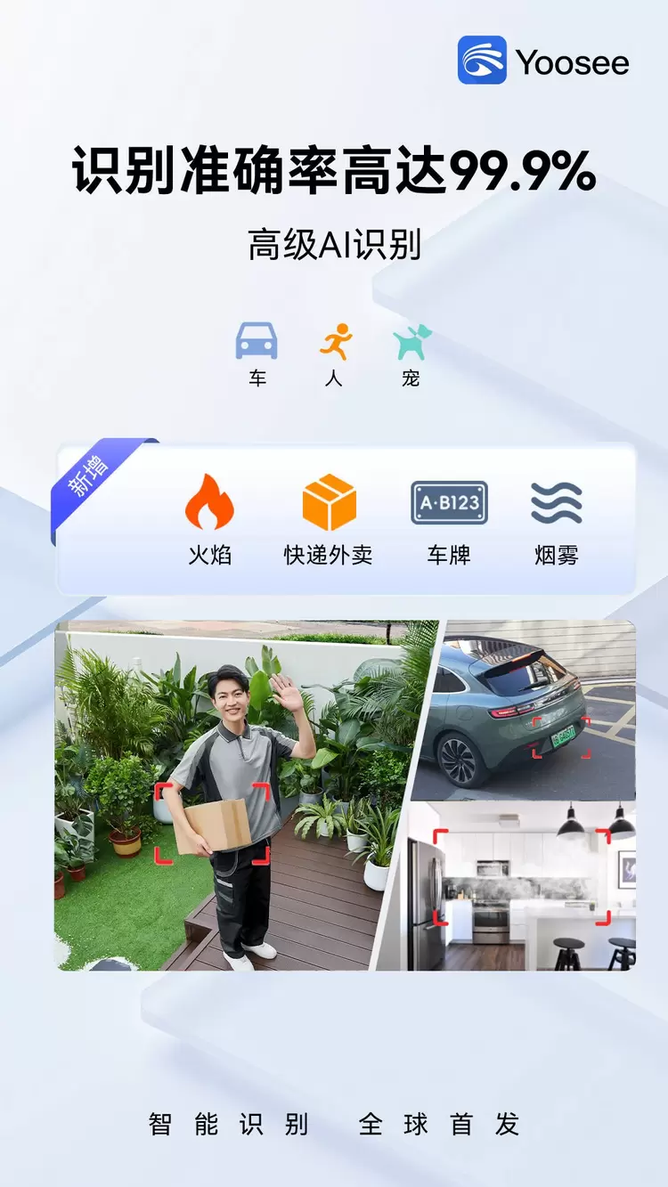 所以,为了让用户的家庭安全更有保障,Yoosee App新增高级AI识别功能,在基础的人形、车辆和宠物等目标识别上,新增对火焰、烟雾、外卖和车牌的识别。