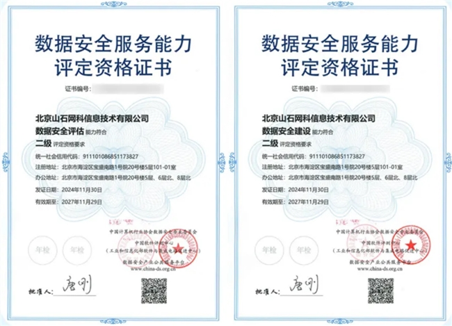 此外,山石网科还荣获中国计算机行业协会数据安全专业委员会与中国软件评测中心联合颁发的两项资质认证:数据安全服务能力评定资格证书--数据安全评估(二级)及数据安全建设(二级)。这标志着山石网科成为极少数在两项认证中均达到最高级别的企业之一,彰显了在数据安全领域的卓越实力与领先地位。