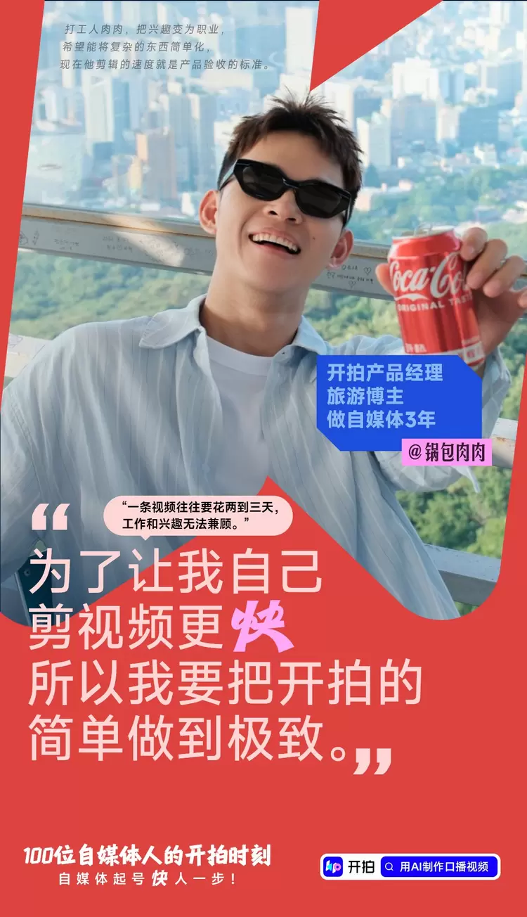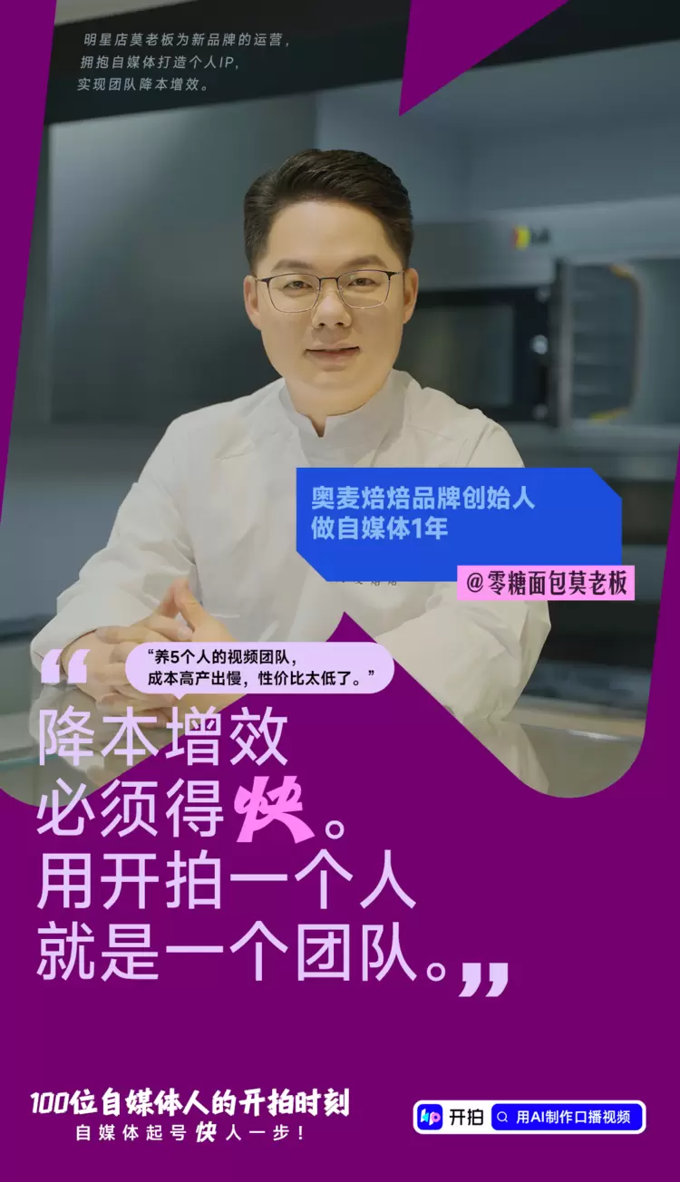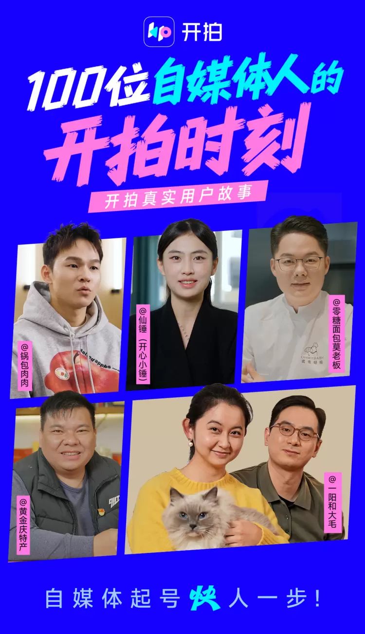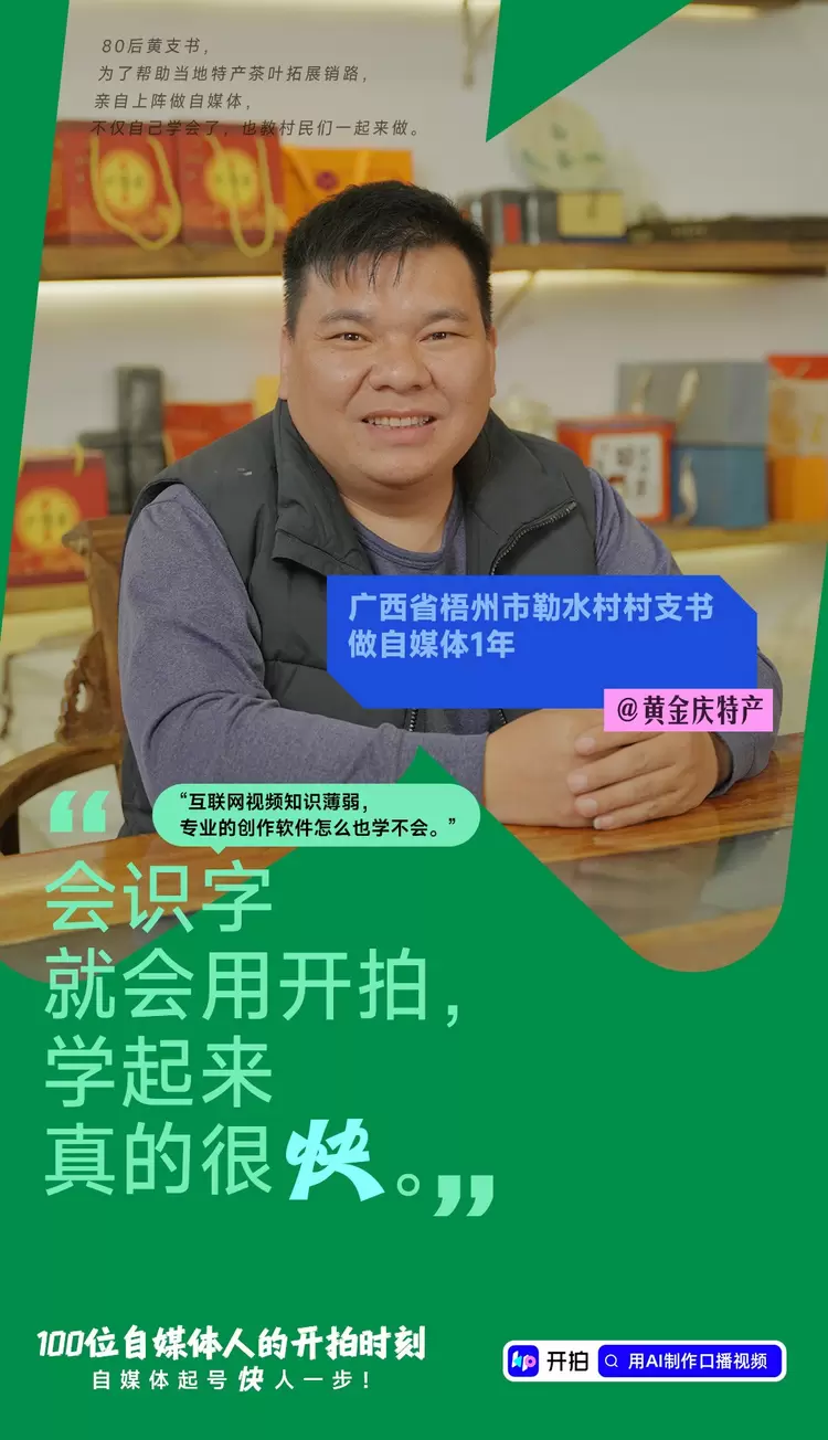 在开拍的帮助下,广西梧州市勒水村黄支书和村民们熟练掌握了口播视频技能,为当地土特产六堡茶打开更广阔的市场;90后创业者奥麦烘焙创始人莫崇中在开拍的助力下提高创作效率,完成了团队分工的优化;一阳和大毛通过开拍共同运营保险自媒体账号,持续提升获客流量,成为“斜杠青年”,获取新的职业突破。因为有了开拍,自媒体创作者肉肉兼顾了工作和爱好,网络与新媒体专业的大三学生仙锤做到了创作能力的提升,实现了经济独立。