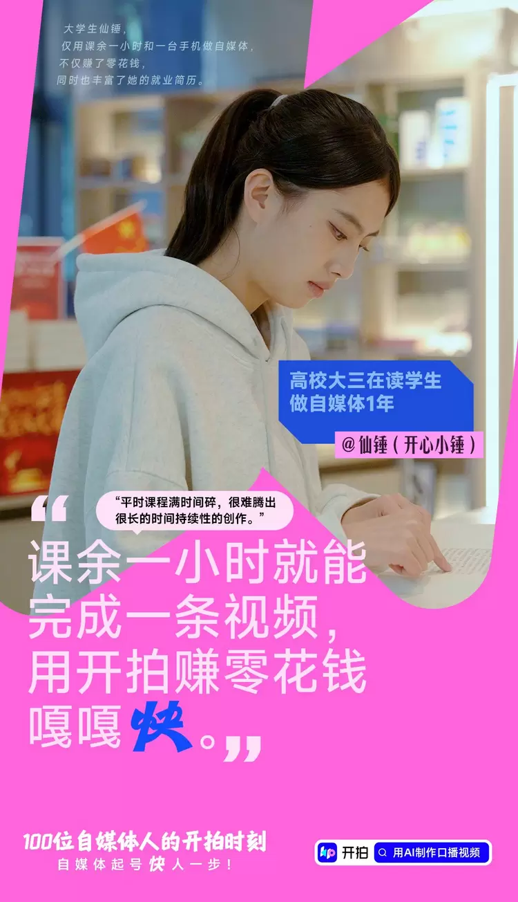 开拍推出的“大学生自媒体创业“助力计划,以厦门为首站,与五所高校达成合作,通过“开拍AI口播班”、“开拍自媒体创业实训基地”、“游学交流会”等线上线下课程形式,与高校共同推进自媒体人才的培养,提升大学生求职竞争力。