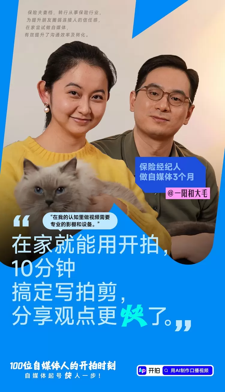 AI技术的发展和应用,为小微创作者带来前所未有的助力。凭借一键包装、智能剪辑、提词器等功能,美图公司旗下AI口播工具开拍App正在帮助小微创作者快速成长。近日,开拍打造了“100位自媒体人的开拍时刻”系列内容,鼓励创作者们通过新技术提升效率,坚持和实现自己的梦想。