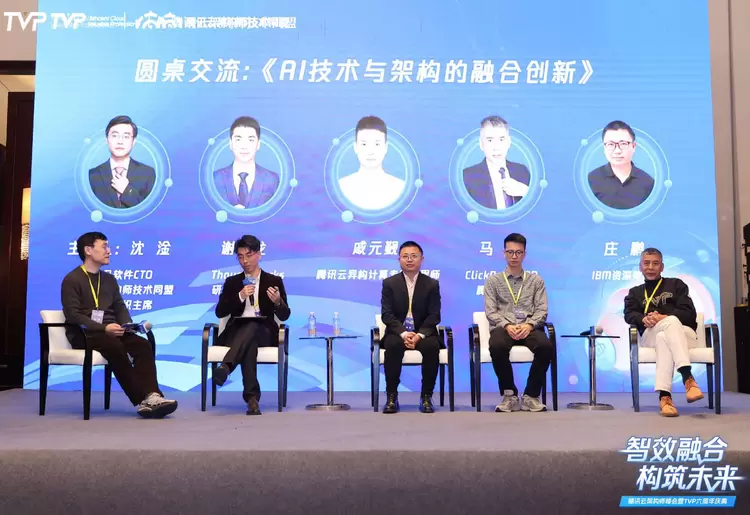 在圆桌对话环节,在正马软件CTO、腾讯云架构师技术同盟活动组织主席沈淦的主持下,谢保龙、庄鹏、戚元觐、马俊围绕《AI技术与架构的融合创新》这一主题,深入探讨了AI 如何改变我们的工作方式,从提升生产力和交付质量,到重塑团队结构和个人技能需求,以及AI在具体项目的落地经验等话题。