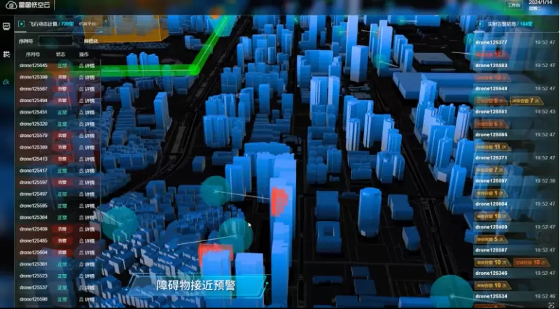 中科星图股份有限公司星图低空云产品负责人杨光辉作低空中台产品演示。“我们开展了大量的物理飞行试验,当飞机接近障碍物时,平台实时弹出障碍告警信息,当无人机靠近或进入系统划设的禁飞区时,平台弹出空域告警,并实时显示侵入的网格位置。”
