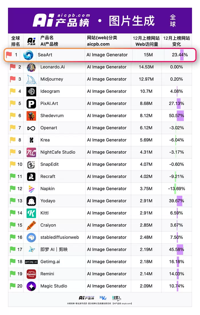 如果AI生图是一场高水平的竞技比赛,那么SeaArt AI就是那个一路“杀疯了”的选手,以绝对优势拿下全球AI生图榜首。数据不会撒谎:2024年12月,SeaArt AI的Web访问量高达1500万,同比增长23.44%,荣登全球AI生图产品的榜首。