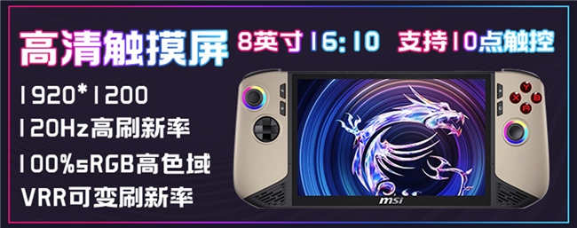 CLAW 8 AI+掌机2025,拥有更大尺寸的8英寸屏幕,16:10比例1920*1200分辨率。虽然感觉只比7英寸增加了1英寸,但实际加大屏幕的观感和游戏冲击力提升,还是很明显的,喜欢更大屏幕的玩家有福了!与此同时,屏幕也支持120Hz高刷、100% sRGB高色域、60Hz/120Hz VRR可变刷新率。针对掌机户外使用的场景,屏幕亮度也达到500nits高亮度,结合更大尺寸屏幕,整体观感都有保证。