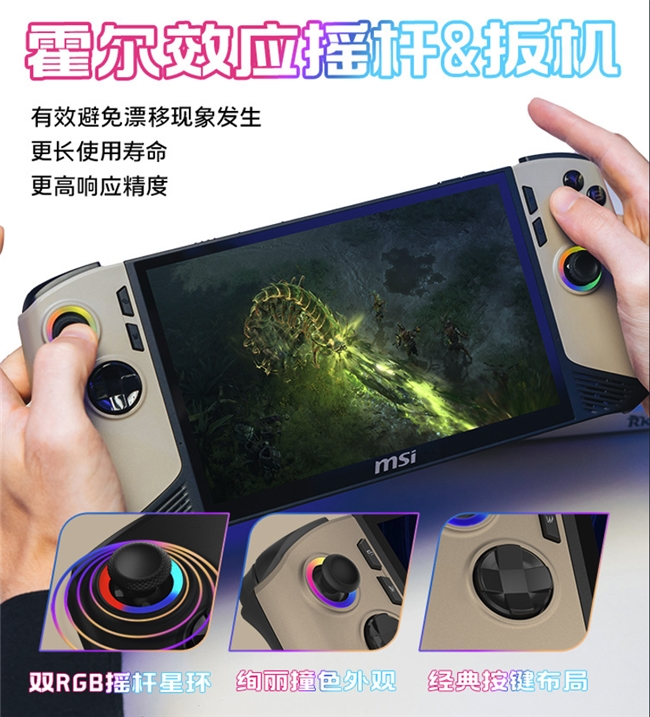由于掌机本体和手柄的一体性特点,微星CLAW 8/7 AI+掌机2025也延续了初代的优势特点,采用了霍尔摇杆/霍尔扳机设计,玩家也无需担心摇杆漂移和耐久性的问题。与此同时,摇杆还支持0死区设置,可以更精细化的进行控制。手柄背部也有可自定义的M1/M2按键,玩家也可以进行按键宏设定,让游戏的操作更简单顺手。