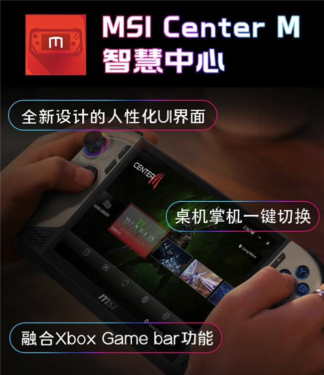 作为一台Win掌机,为了让玩家快速直观的进入游戏和方便设置,专门为掌机开发的控制中心:MSI Center M也升级更新。可以随时在Windows桌面模式和 掌机游戏模式切换,也将快速设定菜单(Quick Setting)和Xbox Game Bar功能整合在一起,更贴近玩家原有的使用习惯。