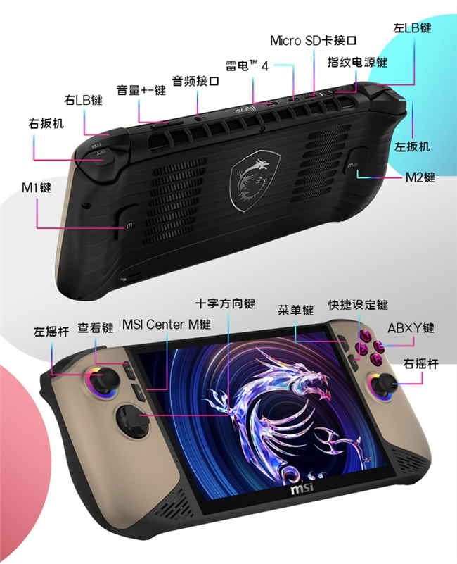 接口配置上,同样拥有Intel平台的雷电4接口优势,并且在CLAW 8/7 AI+ 掌机2025上升级到了双雷电4接口,并且拥有支持指纹识别的电源键,Micro SD卡槽也能方便拓展存储。毕竟对于一款Win掌机,微星CLAW系列本身也是一台便携性十足的Mini PC,双雷电4就可以很自如的实现同时充电,并支持拓展外接显示器来使用。