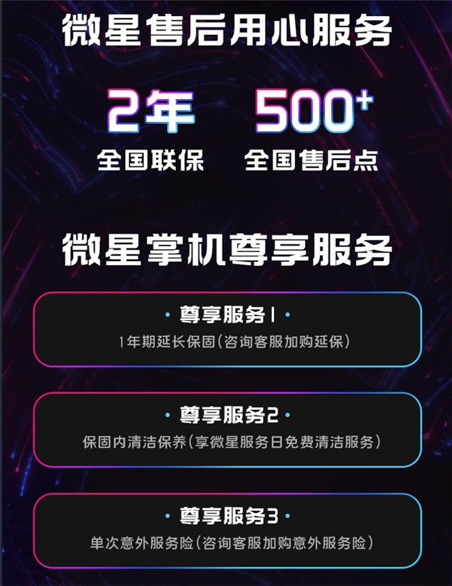 为了让玩家安心游戏,微星CLAW掌机也提供2年全国联保,以及500+全国售后服务中心的支持。还有更多的掌机尊享服务,玩家可以咨询客服来选择。