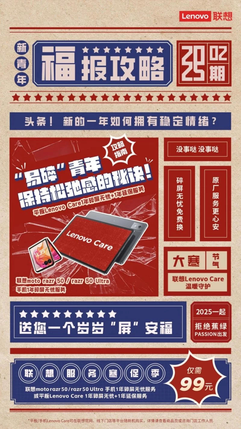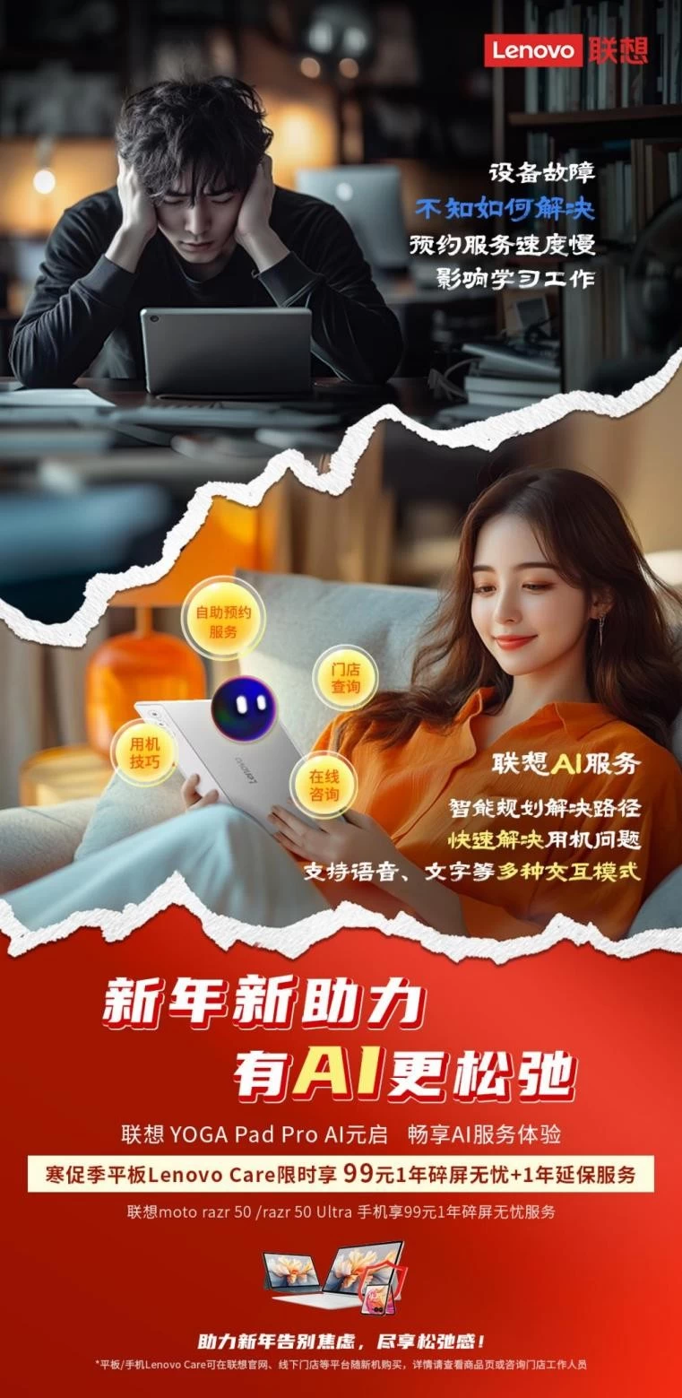 春节是全家团圆的时刻,当家里有亲戚朋友来访时,虽然热闹非凡,但免不了会担心孩子在玩耍手机和平板时失手掉落,或者被其他人不小心碰到地上摔的一个“碎碎平安”让人头大。为了让大家都能享受一个安稳无忧的春节,联想服务推出了平板和联想moto razr 50/razr 50 Ultra手机Lenovo Care寒促季活动,随新机购买仅需99元,就能为家中设备提供全面保障,让设备从此不再“掉链子”。