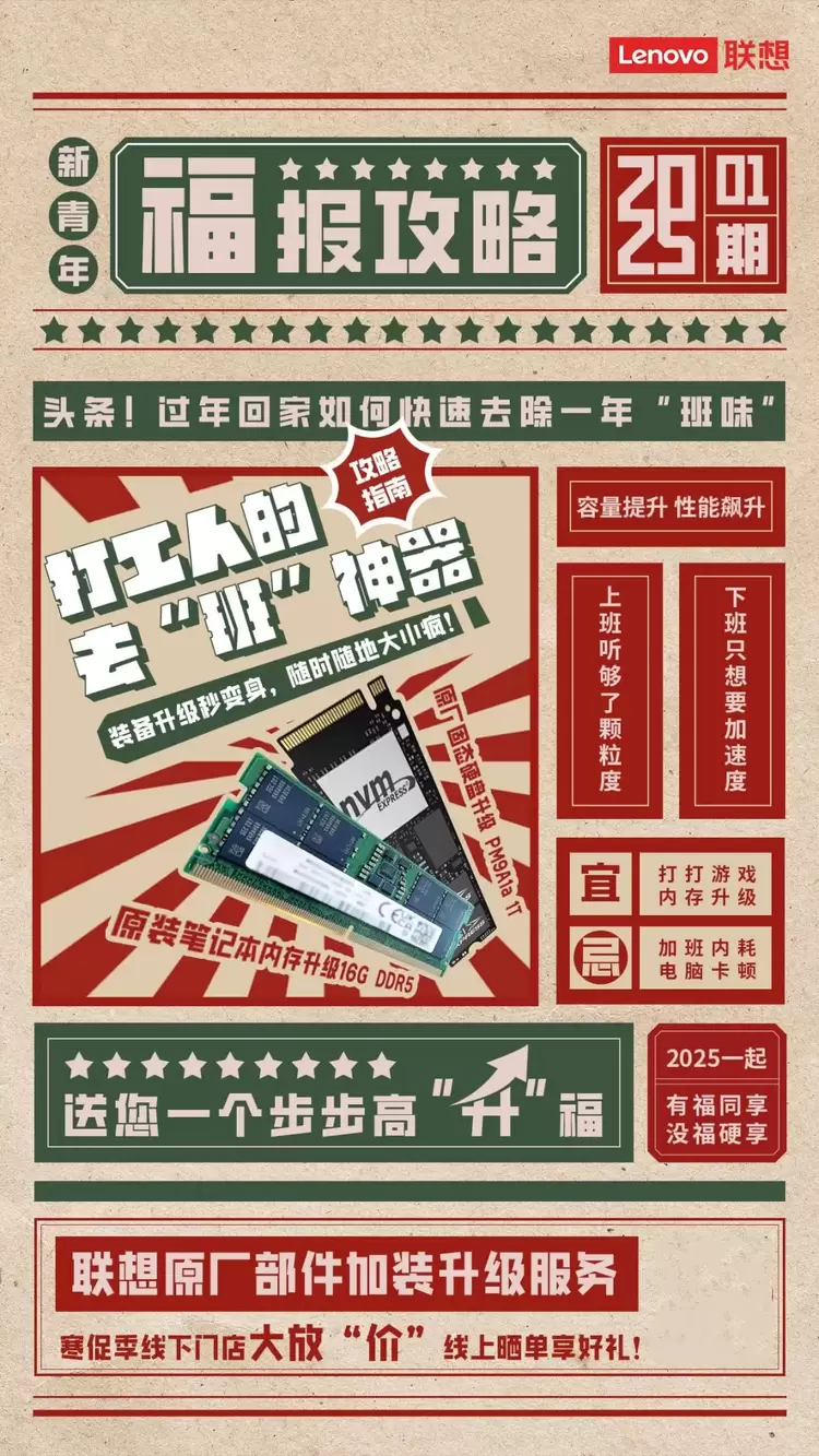 春节不仅要给自己和家人换新装,更要给设备换上性能强劲的“核心装”!联想电脑内存DDR5 16G加装升级服务和原厂固态硬盘PM9A1a 1T加装升级服务,让你的装备升级秒变身,打游戏,春节追剧,轻松去除一年的“班味”!