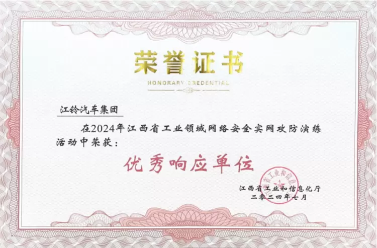 此外,在江西省工信厅组织开展的网络安全实网应急演练活动中,全省367家工业企业参加此次应急演练,其中江铃集团凭借与山石网科携手打造的Open XDR安全运营保障体系,获评“优秀响应单位”的荣誉称号。