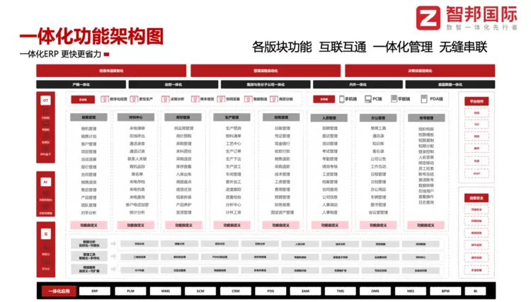 “电子行业一体化ERP”以智邦国际首倡的“企业一体化”管理思想为基础打造而成,通过实现企业内部一体化、横向一体化、纵向一体化、底层数据一体化,从而将企业全局势能凝聚融合,推动企业实现高端化、智能化、绿色化发展。