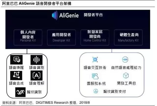 DIGITIMES Research观察,在人工智能技术推波助澜下,语音助理成为智能家庭新焦点,国内互联网业者百度、阿里巴巴与腾讯(BAT)顺势透过智能音响抢占智能家庭市场入口,凭借在网络产业累绩的大数据资源,建立语音开放平台,藉由吸引更多开发者,打造自家生态系统。目前智能音响销售量以阿里巴巴的天猫精灵最多,语音开放平台注册数以百度的DuerOS最多。