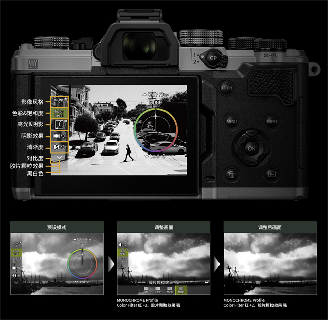 该相机采用了经典的胶片单反相机风格,具有复古的经典设计,同时还配备了“色彩/单色配置控制”和“计算摄影”功能,令您尽享具有创意性的摄影表现。