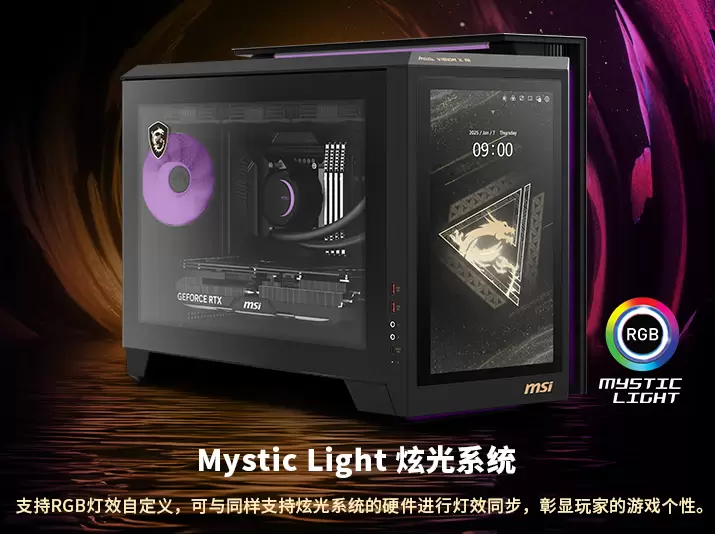 作为第二代产品的核心亮点,微星首创的13英寸AI HMI全高清触摸屏颠覆传统主机交互逻辑。可根据用户场景(如游戏、创作、办公)自动优化性能配置,并联动内置麦克风与扬声器。