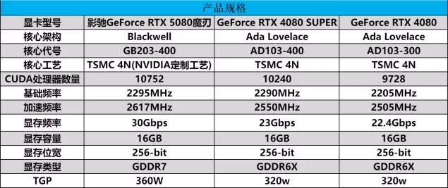 首先,我们可以直观的看到影驰 GeForce RTX 5080 魔刃与GeForce RTX 4080 SUPER和GeForce RTX 4080 的规格参数对比: