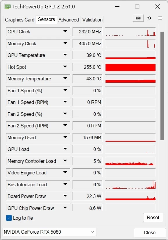 根据GPU-Z可得知影驰 GeForce RTX 5080魔刃具体的参数表现和实际规格。通过数据可以看到,在待机状态下,该卡温度为39℃,功耗仅仅为8.6W。