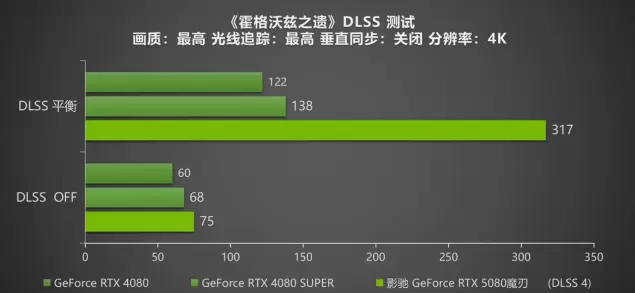 而4K模式下,影驰 GeForce RTX 5080魔刃仅凭自身的性能输出,帧数也能达到流畅运行,凭借DLSS 4技术的加持,帧数也是上涨了214帧。再看到GeForce RTX 4080和GeForce RTX 4080 SUPER,这两者在DLSS 3的加持下,帧数也均破百帧,分别达到看119帧和131帧的成绩。