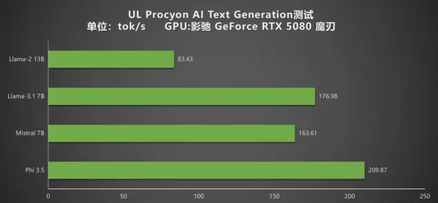 从测试结果可以得知,影驰 GeForce RTX 5080魔刃在四项AI文本生成模型测试中呈现了优异的成绩。即便是在复杂的Llama-2和Llama-3.1模型测试中,成绩也分别达到了83.43 tok/秒和176.98 tok/秒。而在PHI-3.5 mini模型测试中,该卡的实力让其拥有高达209.87 tok/秒的平均输出速率。