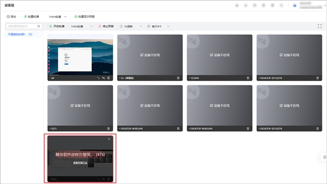 向日葵新版屏幕墙还增强了预警显示能力,支持在单个屏幕墙内显示预警以及批量显示预警:我们只需要首先在IT资产模块中设置相关的预警策略,一旦被控设备触发预警条件,屏幕墙上将立即显示预警效果,提醒我们采取行动。