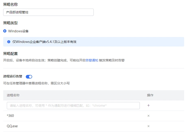 最后,我们可以通过“软件进程告警”功能来实现对一线设备的软件安装进行管理:我们可以为不同的设备(支持按安装包区分策略)设置软件告警策略,添加需要检测告警的软件进程名称。