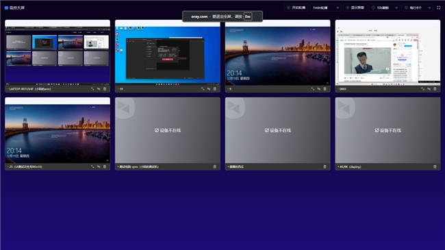 此外,新版屏幕墙支持动态轮播和沉浸式全屏展示;当设备数量过多而一个屏幕展示不下的时候,我们可以设置轮播时间,定时切换监控的设备,保证所有设备的屏幕信息都有一定的展示时间。