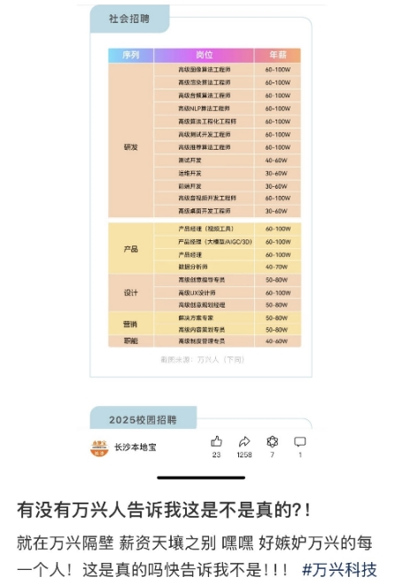 此前,据万兴科技官方信息,企业部分社招岗位年薪可达百万,例如高级商业化产品经理、高级产品策划经理等等。然而,这样高额的薪资是否真的如官方所宣称的那样呢?在社交媒体平台上,有网友在社媒平台上发帖提出类似问题后,吸引了不少自称是万兴科技员工的网友回复。