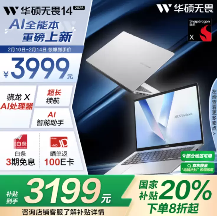 目前无畏14 骁龙版 2025已上架预约,购机即可参与国家补贴活动,最高立减20%,无畏14 骁龙版 2025补贴到手价仅需3199元(部分地区可用,可咨询店铺客服了解补贴详情)。